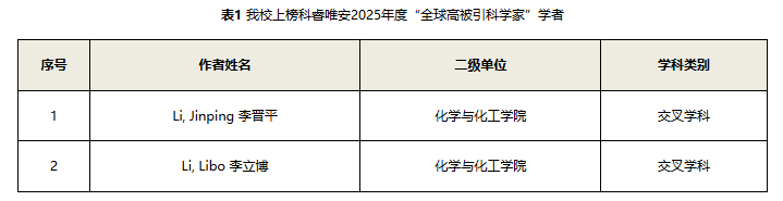 重点实验室李晋平教授和李立博教授入选科睿唯安2025年度“全球高被引科...