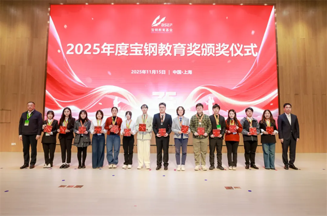 11月15日,2025年度宝钢教育奖颁奖仪式在上海举行。今年,来自清华大学、北京大学等全国115所高等院校的282名教师、509名学生荣获宝钢教育奖,我校3名教师和4名学生凭借出色表现荣获2025年度宝钢教育奖。其中,我院2022级硕博连读生张议洁凭借其在科研创新与学术领域的突出表现,荣获“宝钢优秀学生奖”,并作为我校获奖师生代表登台领奖。
