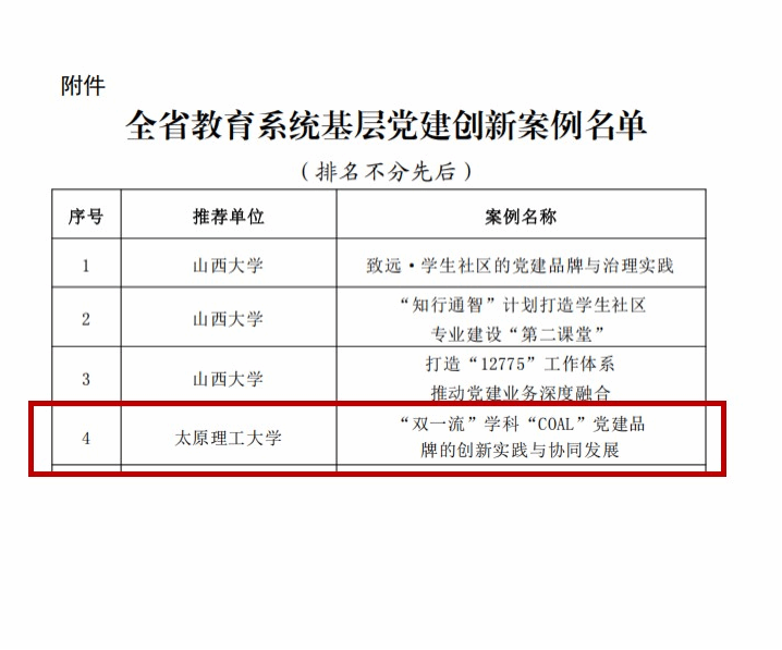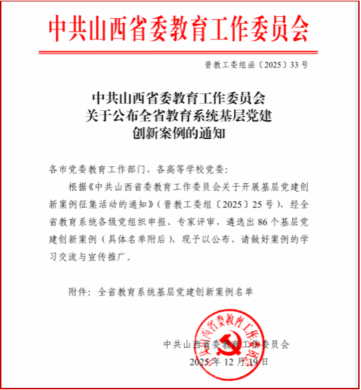 近日,中共山西省委教育工作委员会发布了《关于公布全省教育系统基层党建创新案例的通知》(晋教工委组函〔2025〕33号)。经过各级党组织申报、专家评审等严格遴选环节,最终全省共有86个基层党建创新案例脱颖而出。其中,我院第六研究生党支部申报的《“双一流”学科“COAL”党建品牌的创新实践与协同发展》案例成功入选。