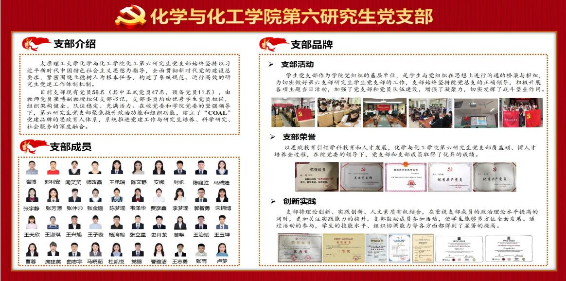 “COAL”党建品牌案例的成功获评,彰显了我院第六研究生党支部在基层党建工作中的探索精神和实践能力。院党委将以此为契机深化“COAL”党建品牌的建设,发挥其对全院研究生党支部的引领示范效应,聚焦研究生成长成才,赋能科研创新与社会服务,为学校“双一流”及山西教育强省建设培育高素质人才,贡献化工力量。