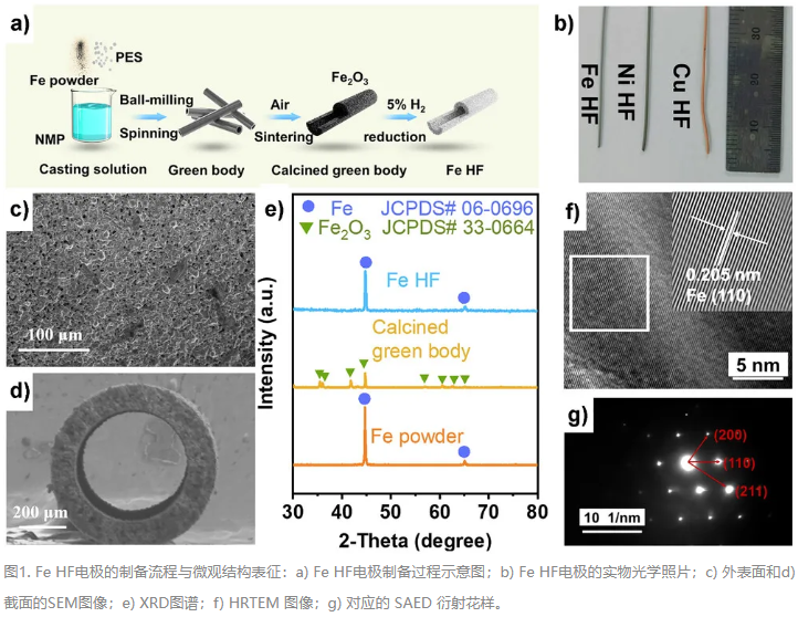 本研究通过相转化/烧结工艺成功制备了自支撑铁基中空纤维(Fe HF)电极,并系统研究了其电催化氮还原(NRR)性能与反应机制。Fe HF呈现相互贯通的三维多孔结构,壁厚约110 μm,XRD与HR-TEM结果一致表明其主体为金属铁相,并暴露(110)晶面。XPS分析显示表面存在微量Fe²⁺/Fe³⁺氧化层,但未检测到含氮杂质,排除了外来氮污染对性能评估的干扰(图1)。电化学测试表明,在N₂气氛下Fe HF表现出明显增强的电流响应,显示其具有良好的氮气活化能力。在−0.6 V vs. RHE条件下,Fe HF实现了27.1 μg h⁻¹ cm⁻²的氨产率和3.5%的法拉第效率,较平面铁电极分别提高约60倍和35倍,且未检测到副产物N₂H₄生成(图2)。
