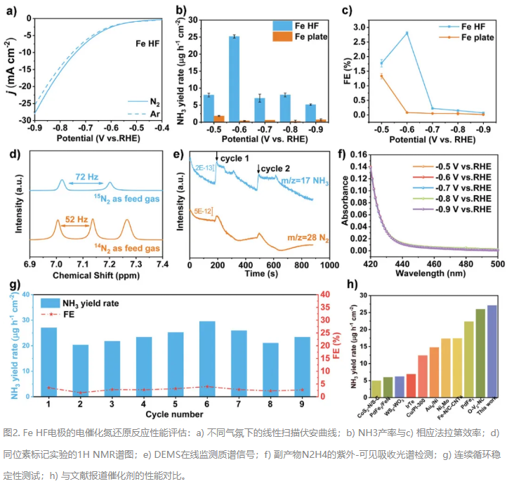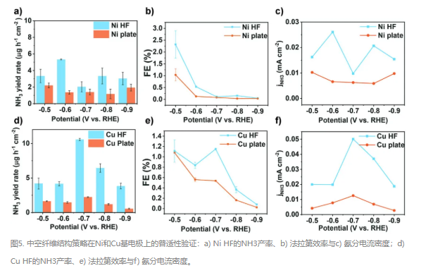 该中空纤维策略表现出良好的普适性,在镍和铜基中空纤维电极(Ni HF、Cu HF)中同样观察到NRR性能的显著提升(图5a–f),表明该结构设计策略可用于多种金属催化剂,为高性能电合成氨系统的开发提供了新思路。