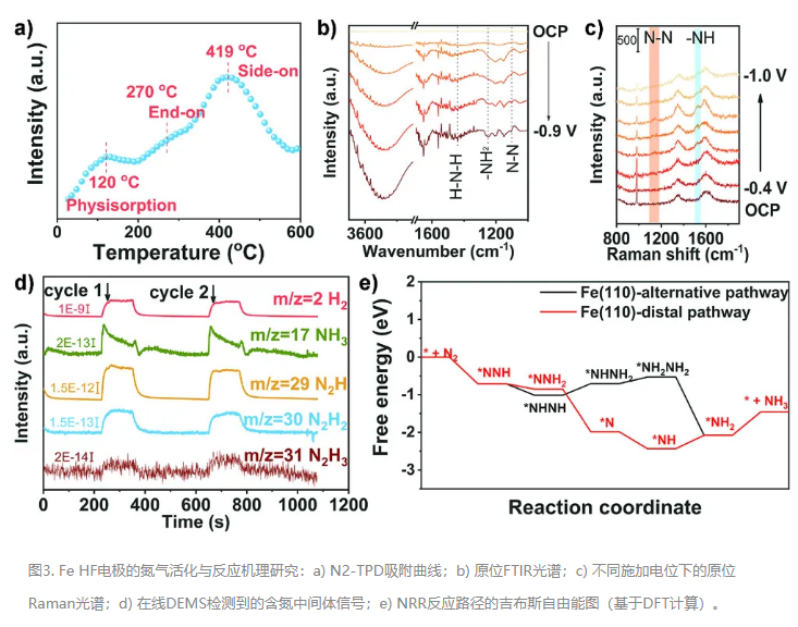 为阐明氨的来源,研究通过¹⁵N₂同位素标记实验和在线微分电化学质谱(DEMS)证实NH₃中的氮完全来自供给的N₂气体(图2d,e)。连续循环测试及循环后SEM、TEM与XPS表征表明Fe HF具有优异的电化学稳定性和结构耐久性(图2g)。其性能优于多数已报道的非贵金属NRR电催化剂(图2h)。机理研究表明,Fe HF可通过其分级多孔结构显著促进N₂的吸附与活化。N₂-TPD显示在419 °C处存在强烈的化学吸附峰,归属于N₂的侧向吸附模式(图3a)。原位FTIR和R光谱检测到关键中间体N₂Hₓ(x=3–4)的振动信号,其在反应电位下逐渐增强(图3b,c)。DEMS进一步监测到m/z = 29–31的含氮中间体碎片,印证了NRR沿交替路径进行(图3d)。DFT计算表明,Fe (110)面对N₂的首步加氢能垒较低(ΔG = -0.71 eV),速率决定步骤为第二次NH₃的形成(ΔG = 0.62 eV),交替路径在热力学上优于远端路径(图3e)。