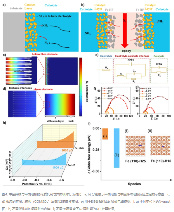 与平面电极依赖溶解N₂的传质机制不同,Fe HF通过独特的气体穿透扩散模式将N₂直接输送至活性界面,显著强化了局部氮气浓度并抑制了水分子及H中间体的竞争吸附(图4a–d)。有限元模拟显示其反应区域N₂浓度显著高于平面电极(图4c,d)。通过电化学阻抗谱拟合得到的H吸附电荷(QH)表明,Fe HF的H覆盖度远低于平面电极,从而有效抑制析氢副反应(图4f–h)。DF计算进一步证实,低*H覆盖表面(Fe HF)更利于N₂的吸附与活化(图4i)。