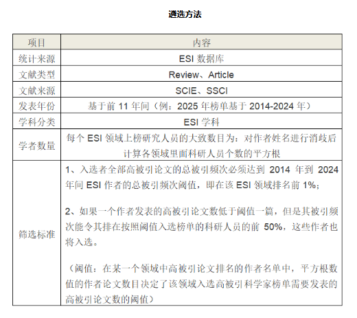 “全球高被引科学家名单”是科睿唯安每年发布的科学家名单,旨在通过量化评估遴选出在自然科学或社会科学领域产生重大全球影响力的研究人员,该名单基于科学信息研究所对Web of Science核心合集的SCIE和SSCI期刊高被引论文数据进行分析。