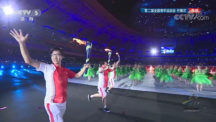 从芮城西侯度遗址到龙城红灯笼体育场,二青会圣火历经33个省级行政区网上传递和近3500名火炬手的交接传递,在当晚点燃二青会主会场高高耸立的火炬塔。当晚21时15分许,激动人心的场内火炬传递和主火炬点燃仪式正式开始。李秋喜、李立博和山西省教练员优秀代表蔡光亮三位火炬手将青运圣火,传递给山西大学政治与公共管理学院研究生、全国残疾人运动会奖牌获得者、“时代新人”高思恩,“海鸥女子锻炼队”第十一任队长、农村妇女体育代表、2008年北京奥运会火炬手李英,山西省优秀运动员代表、中国女子射击运动员赵若竹。6位火炬手与智能机械臂共同点燃“浑天仪”造型的主火炬装置,主火炬装置借助“火凤凰”点燃主火炬塔。圣火的点燃将现代视觉艺术与高新科技完美融合,首次实现了“场内场外、火炬手与机器人、实景和虚拟”相结合,展现了山西转型发展的强劲态势和浴火重生的坚定决心,象征着山西正以崭新姿态走向光明未来,创意大胆,气势恢宏。当青运圣火在“红灯笼”旁的主火炬塔绚丽绽放的瞬间,全场群情激昂,欢声雷动,现场的气氛被推向高潮。青运圣火照耀龙城,不仅点燃了青运健儿奋力拼搏的激情,也点燃了三晋儿女参与运动的热情。